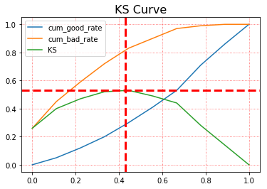 對(duì)表1數(shù)據(jù)進(jìn)行可視化,便得到KS曲線,主要使用到最后三列數(shù)據(jù),即cum_good_rate、cum_bad_rate和KS,具體代碼和圖像如下: