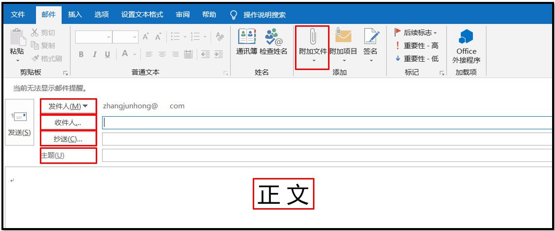 下圖是outlook中發(fā)送一份郵件的界面,主要包含發(fā)件人、收件人、抄送人、主題、正文、附件這幾部分。這也是一般郵件比較通用的組成部分。