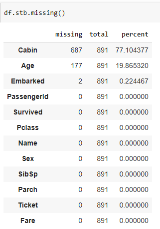 sidetable 中 missing()函數(shù)生成一個匯總表,該匯總表按每列的總缺失值的計數(shù)和百分比顯示缺失記錄。