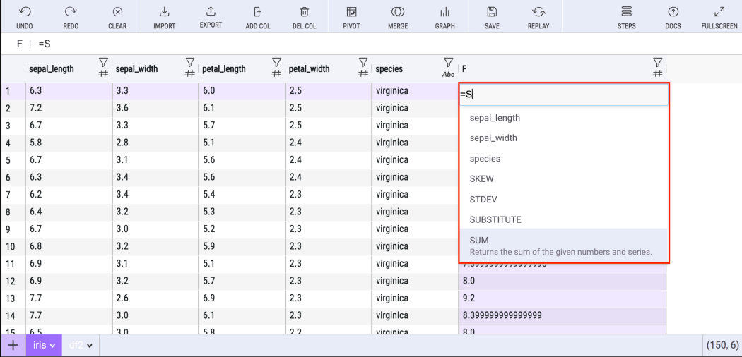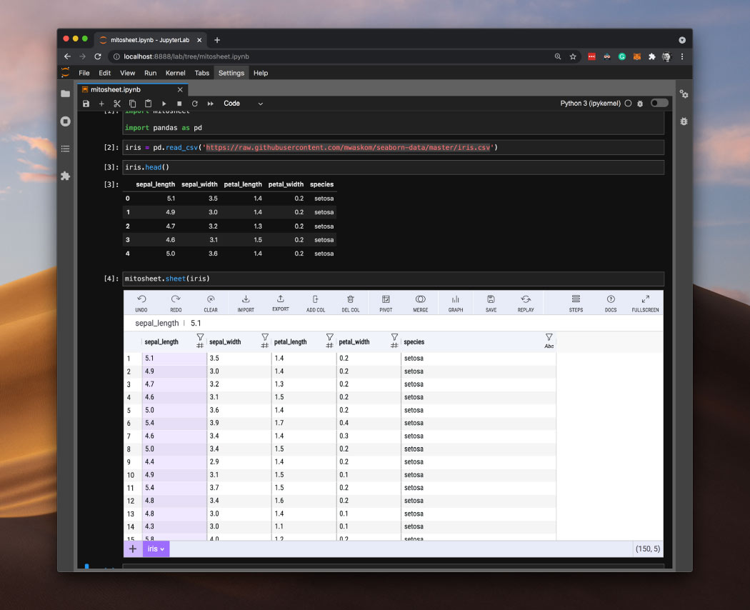 import mitosheet import pandas as pd url = 'https://raw.githubusercontent.com/mwaskom/seaborn-data/master/iris.csv' iris = pd.read_csv(url) mitosheet.sheet(iris)
