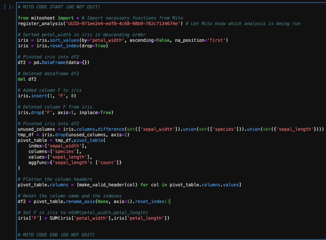 Mito 可以將每個(gè)操作轉(zhuǎn)換為 Pandas 代碼,然后你可以與同事共享這些代碼。這對(duì)于經(jīng)驗(yàn)不足的數(shù)據(jù)科學(xué)家來(lái)說(shuō),是一個(gè)很棒的功能。我做了一些點(diǎn)擊,Mito 生成了以下代碼片段: