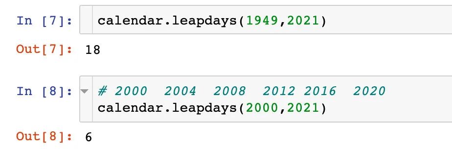 查看兩個(gè)年份之間有多少閏年。比如第二個(gè)例子中,從2000年開始到2021年共有6個(gè)閏年