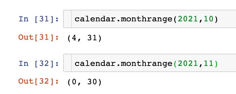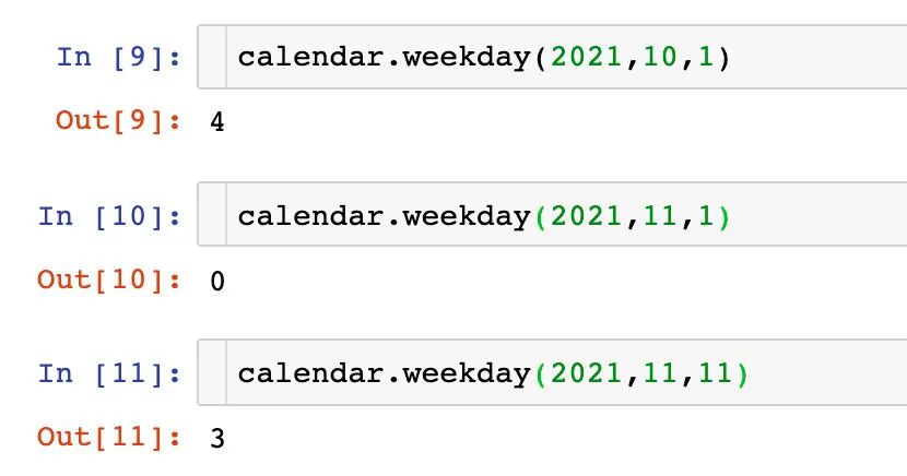 10月份的第一天是星期五,11月份的第一天是星期一(0代表周一)
