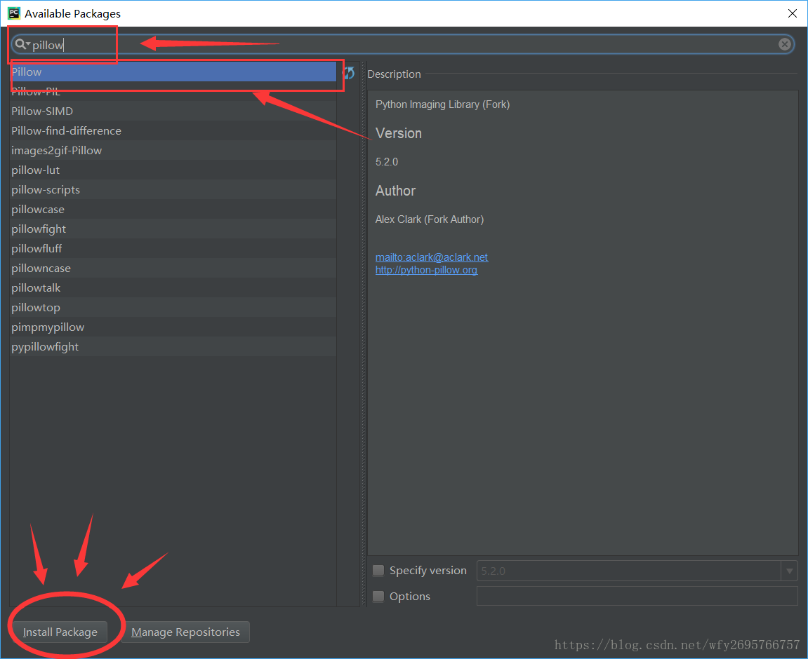 在搜索欄中輸入pillow,選中第一個pillow,然后安裝。