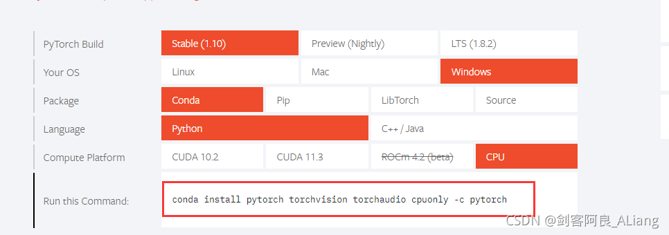 選擇對應(yīng)的命令安裝Pytorch庫。