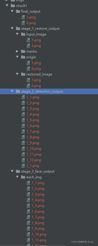 輸出的文件不但有最終的結(jié)果,也有檢測出來的每個臉的處理前后效果。結(jié)果結(jié)構(gòu)如下: