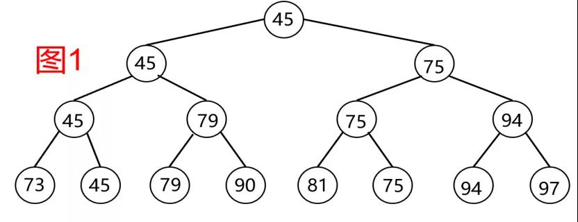 1.構(gòu)建二叉樹:圖1是數(shù)據(jù)表A構(gòu)成的二叉樹,首先直接將數(shù)據(jù)表A的數(shù)據(jù)直接放在最下面,也就是二叉樹的葉子;然后從左到右兩兩進(jìn)行比較,例如73和45比較后選出最小的45,79和90比較后選出最小的79,將選出的45和79比較選出最小的45,一直這樣重復(fù)操作,直到構(gòu)成一個(gè)完整的二叉樹。