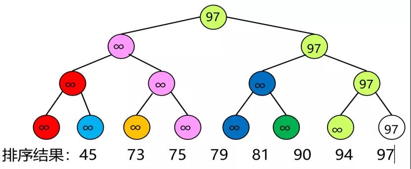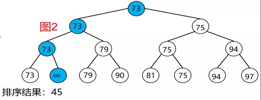 2. 如何輸出正確順序:根據(jù)圖1可以知道根節(jié)點(diǎn)是45,也就是最小的。圖2就是把第一遍找出來(lái)的45用無(wú)窮符號(hào)代替,然后又兩兩比較,直到根節(jié)點(diǎn)變?yōu)樽钚〉?,通過(guò)圖1和圖2對(duì)比可以看出第一遍找到的最小的是45,第二遍是73,,現(xiàn)在又將找出來(lái)的73用無(wú)窮符號(hào)代替,又重復(fù)上面的操作,直到對(duì)所有數(shù)據(jù)排完序。如下圖所示