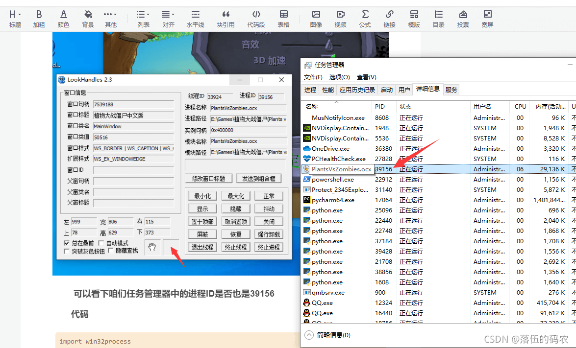 import win32process # 進(jìn)程模塊 import win32gui # 界面 # none 窗口的類名 窗口的ID window_handle = win32gui.FindWindow(None, "植物大戰(zhàn)僵尸中文版") #Pyspy++ 窗口句柄win32gui. print(window_handle) process_id = win32process.GetWindowThreadProcessId(window_handle)[1] #取進(jìn)程ID print(process_id) process_handle = win32api.OpenProcess(0x1F0FFF, False, process_id)#進(jìn)程句柄 # 進(jìn)程句柄是否可以被子進(jìn)程繼承,一般選false(不可被繼承) # #這種是用線程內(nèi)核對(duì)象的默認(rèn)安全屬性, 子進(jìn)程不能繼承父進(jìn)程的句柄,不可以繼承, # 則子進(jìn)程是不可以通過句柄訪問改內(nèi)核對(duì)象。 print(process_handle)