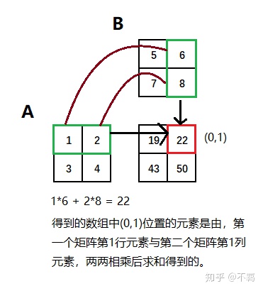 若矩陣A是m*n階的,B是p*q階的矩陣,AB能相乘,首先得滿足:n=p,即A的列數(shù)要等于B的行數(shù)。運算的方法如下圖: