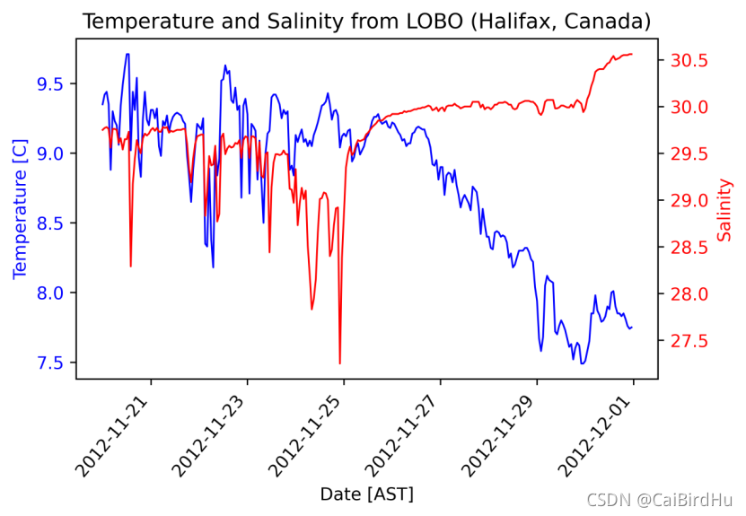 plt.title("Temperature and Salinity from LOBO (Halifax, Canada)")