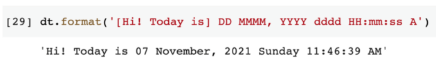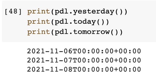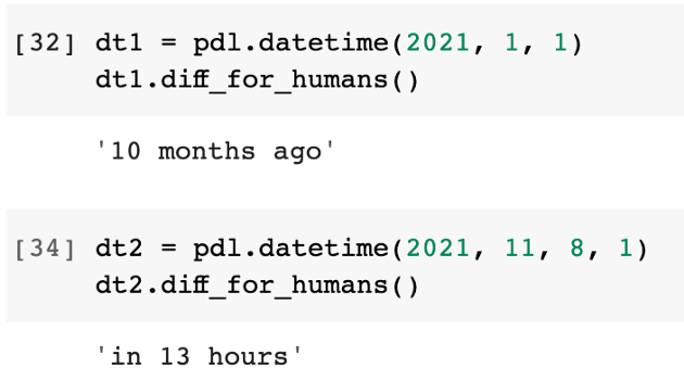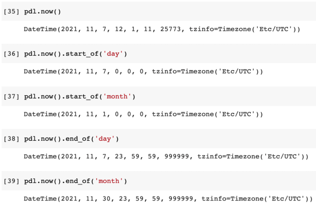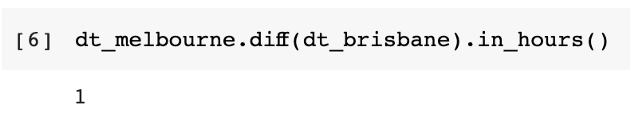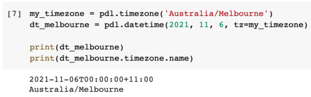 dt_melbourne = pdl.datetime(2021, 11, 6, tz='Australia/Melbourne') dt_brisbane = pdl.datetime(2021, 11, 6, tz='Australia/Queensland') print(dt_melbourne) print(dt_brisbane)