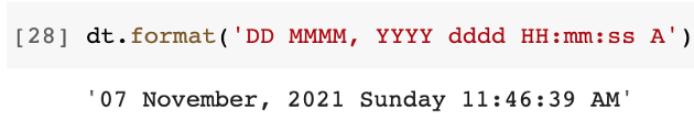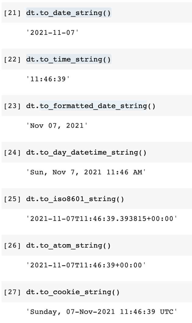 然后,讓我從 Pendulum 中挑選幾個“to string”方法的例子,看看用開箱即用的格式輸出日期時間是多么容易。