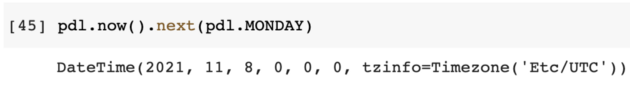 內(nèi)置 datetime 模塊的另一個不便之處是查找一周中的某一天。 例如,如果我們要查找下周一的日期,這可能是最簡單的方法。