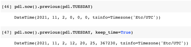 同樣,我們可以使用 previous() 方法來查找上一個星期二,如下所示。 此外,我們可以通過設(shè)置參數(shù) keep_time=True 來保留時間部分。