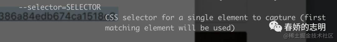 那我想要截取頁面的某個部分轉(zhuǎn)換成圖片呢,webkit2jpg 完全 ok,查看使用文檔之后發(fā)現(xiàn)它是可以傳入 CSS選擇器參數(shù)