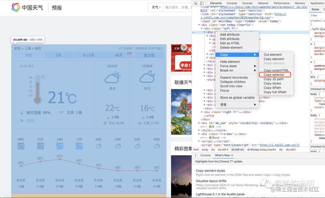 通過 chrome 瀏覽器的調(diào)試工具,可以很容易的找到指定區(qū)域的網(wǎng)頁元素所對應(yīng)的選擇器