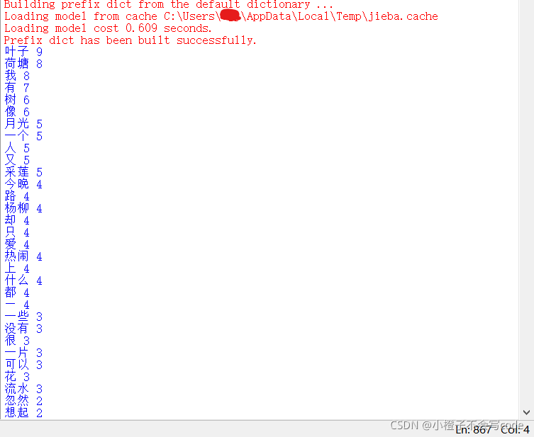 swd = sorted(list(dic.items()), key=lambda lst: lst[1], reverse=True) # 統(tǒng)計每個詞出現(xiàn)次數(shù),從高到第排序