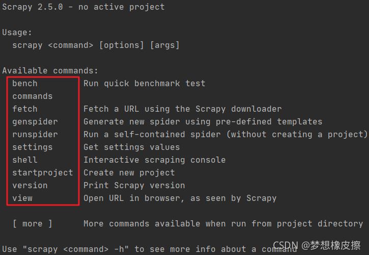 上述截圖是 scrapy 的內(nèi)置命令列表,標(biāo)準(zhǔn)的格式的 scrapy <command> <options> <args>,通過(guò) scrapy <command> -h 可以查看指定命令的幫助手冊(cè)。