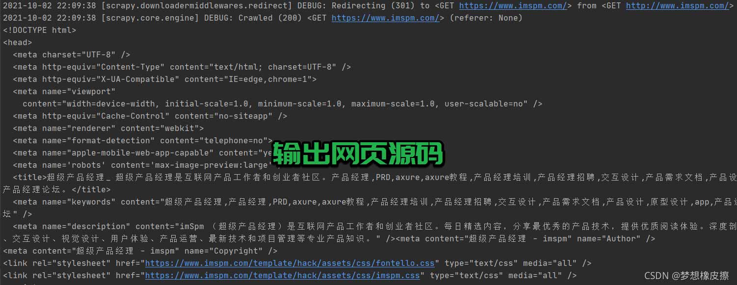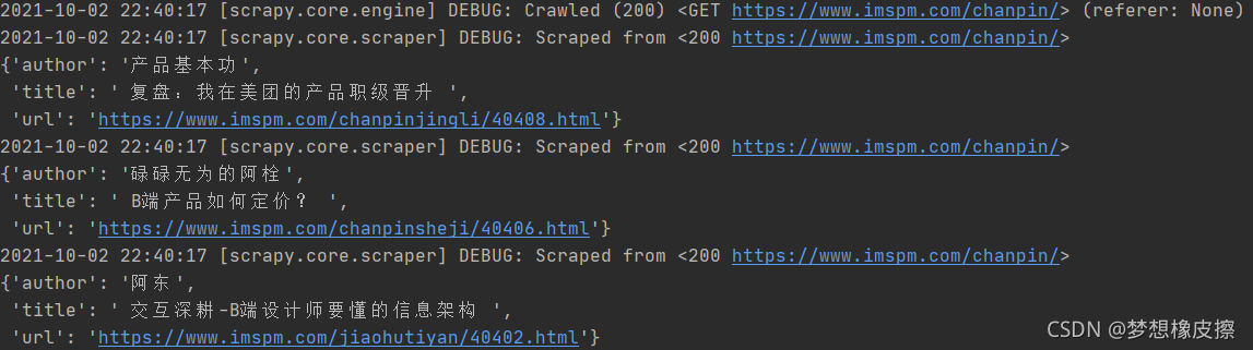 使用 scrapy crawl pm 運(yùn)行爬蟲(chóng)之后,所有輸出內(nèi)容與說(shuō)明如下所示: