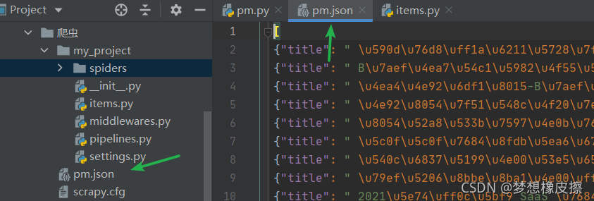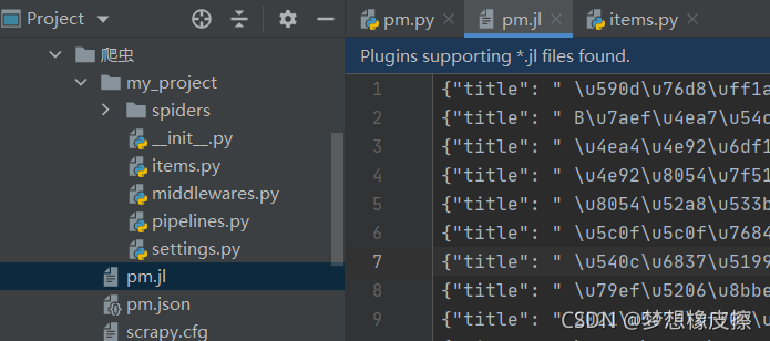 如果想要將每條數(shù)據(jù)存儲(chǔ)為單獨(dú)一行,使用如下命令即可 scrapy crawl pm -o pm.jl 。