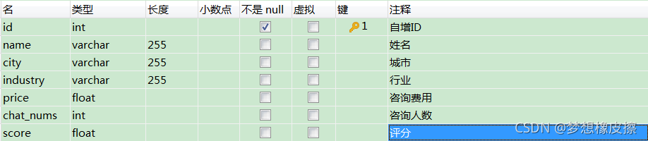 本次數(shù)據(jù)保存到 MySQL 數(shù)據(jù)庫中,基于目標數(shù)據(jù),設(shè)計表結(jié)構(gòu)如下所示。