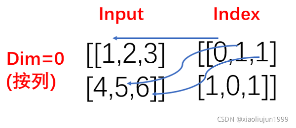 # 按列進行索引 tensor([[1, 5, 6], [4, 2, 6]]) # 按行進行索引 tensor([[1, 2, 2], [5, 4, 5]])