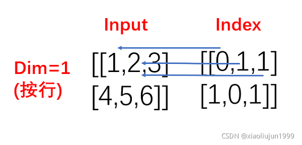 input=torch.tensor([[1,2,3],[4,5,6]]) #作為輸入 index1=torch.tensor([[0,1,1],[0,1,1]]) #作為索引矩陣 # dim=0時,按列進行索引 print (torch.gather(input,dim=0,index=index1)) # dim=1時,按行進行索引 print (torch.gather(input,dim=1,index=index1))