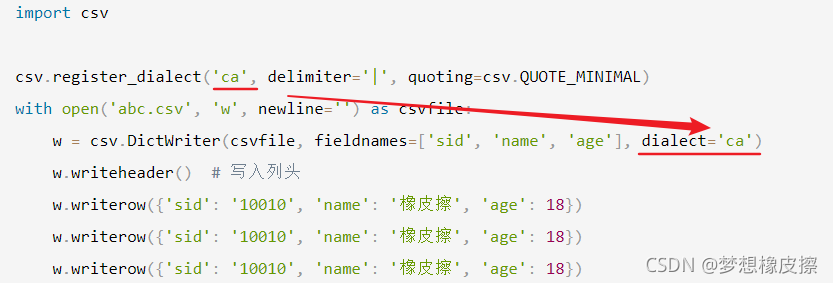 w = csv.DictWriter(csvfile, fieldnames=['sid', 'name', 'age'], dialect='ca')