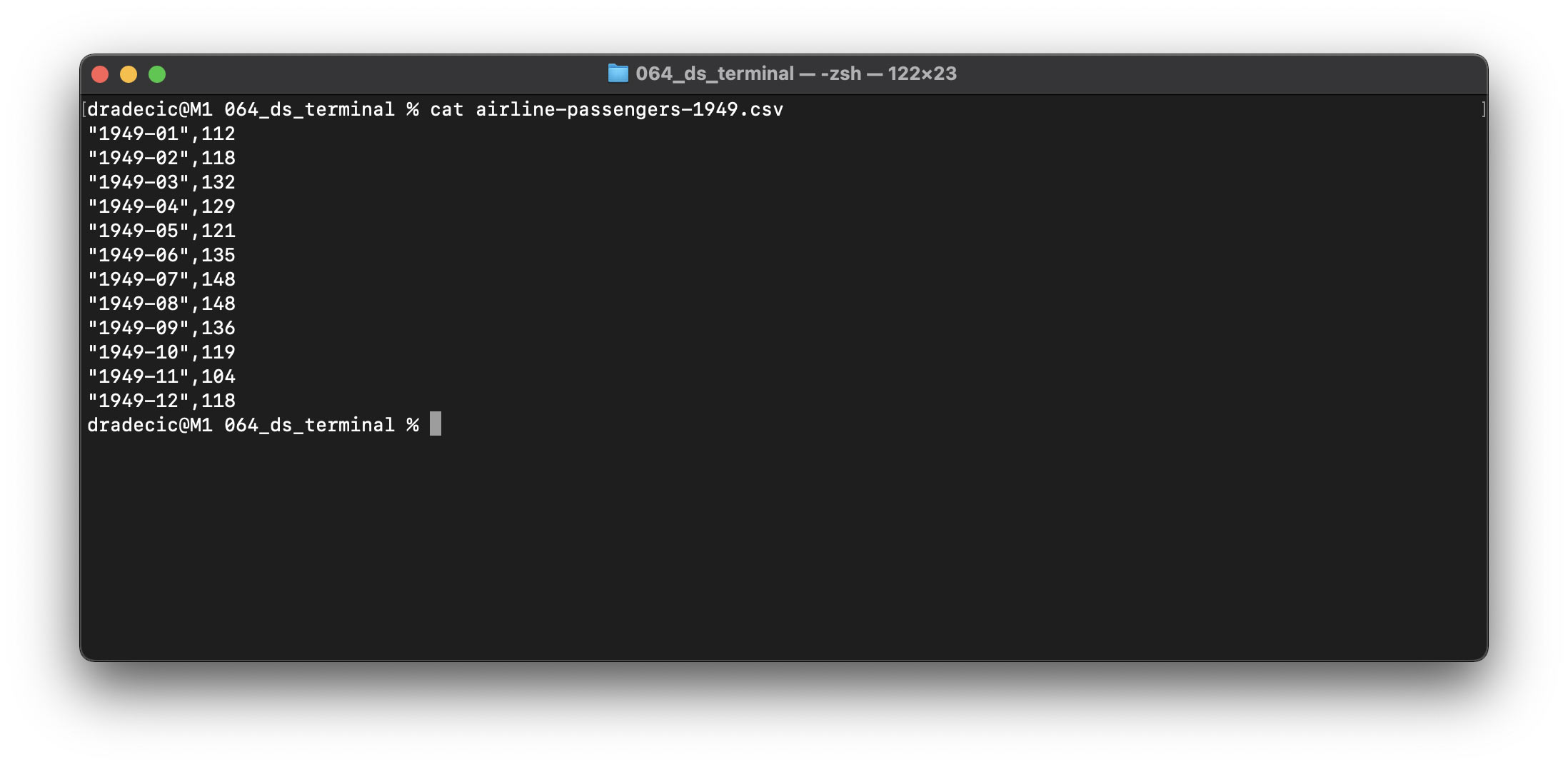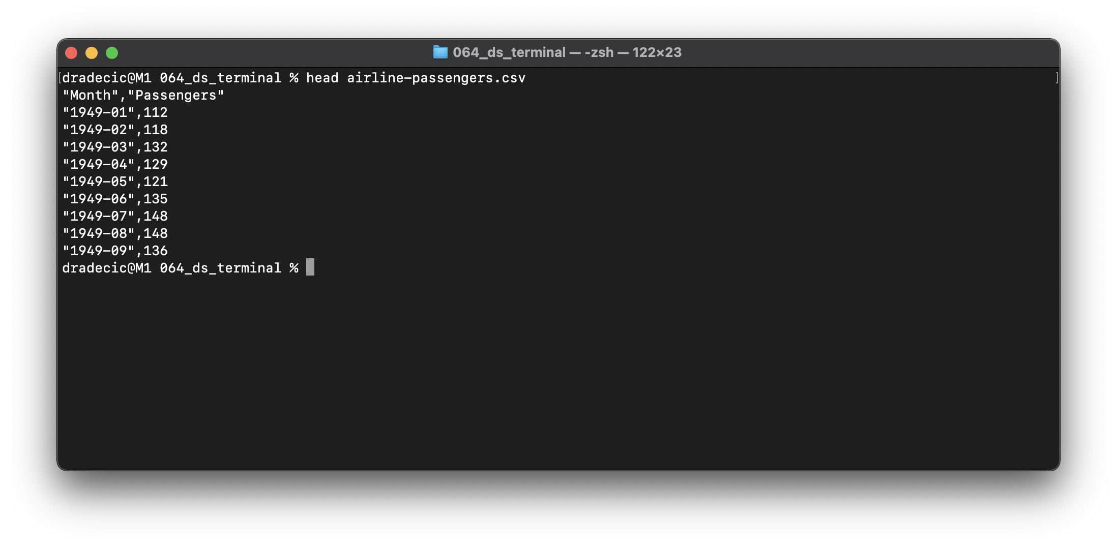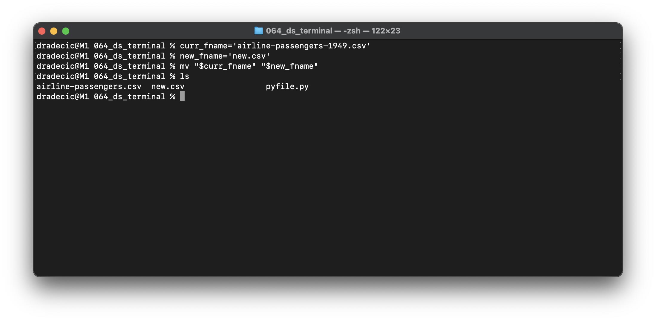 下面是如何聲明兩個字符串變量并使用mv命令將airline-passengers-1949.csv文件重命名為new.csv: