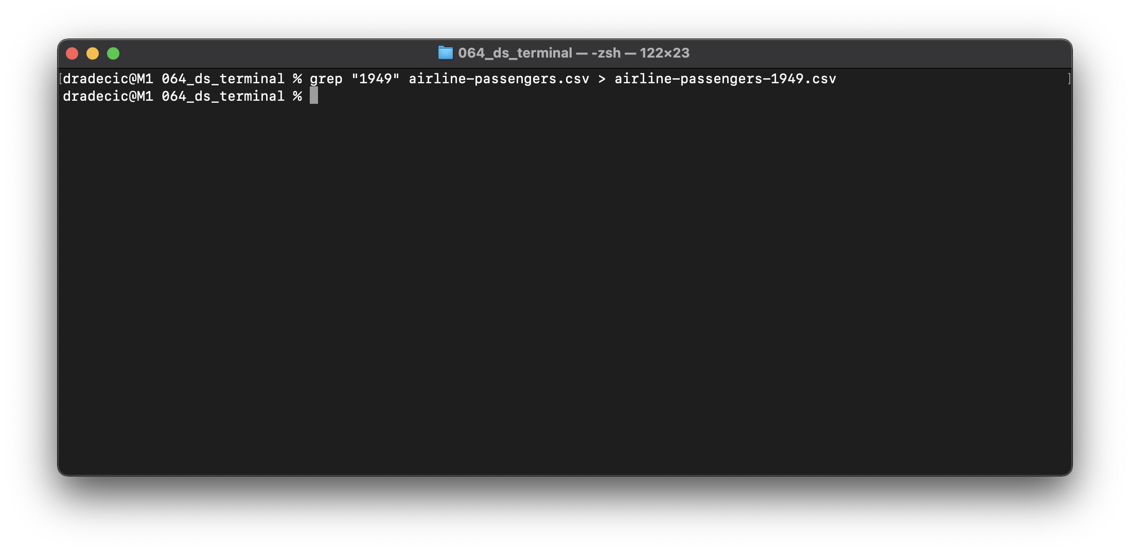 此命令用于處理文本,可以匹配字符串和正則表達式。我們將使用它只提取包含字符串“1949”的行。這是一個簡單的數(shù)據(jù)集,所以我們不會有任何問題。默認情況下,grep命令將打印結果,但我們可以將其保存到另一個CSV文件: