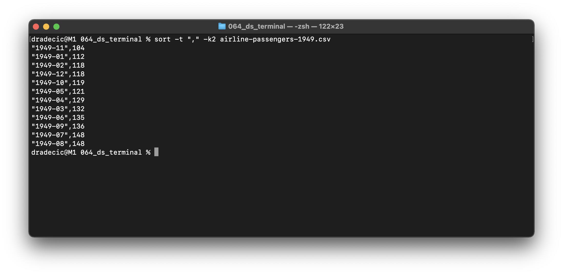 顧名思義,sort命令可用于按某種標準對文件內(nèi)容進行排序。例如,以下命令按乘客數(shù)量升序對數(shù)據(jù)集進行排序: