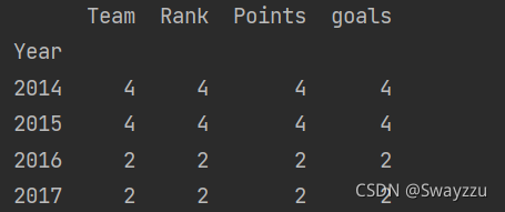 原來(lái)的特征有5個(gè),分別為:year, team, rank, points, goals,現(xiàn)在按照year來(lái)分組并統(tǒng)計(jì)數(shù)量,那么第一行第一列的數(shù)據(jù)“4”,意思就是:在2014年,有4個(gè)team