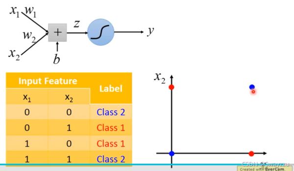 邏輯回歸分類的時候,是把線性的函數(shù)輸入進(jìn)sigmoid函數(shù)進(jìn)行轉(zhuǎn)換,后進(jìn)行分類,會在圖上畫出一條分類的直線,但像下圖這種情況,無論怎么畫,一條直線都不可能將其完全分開。