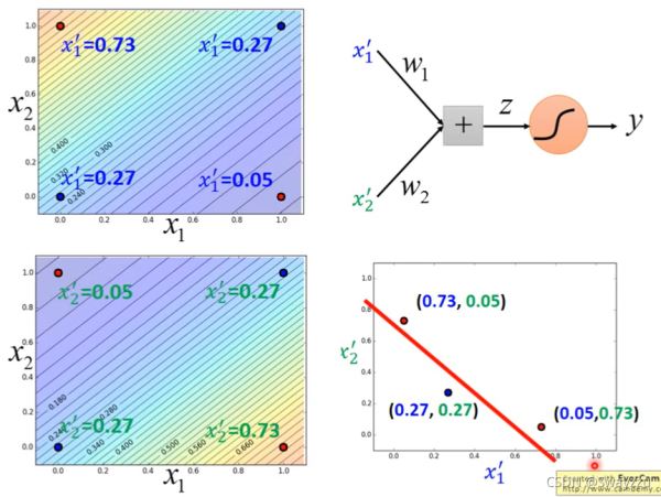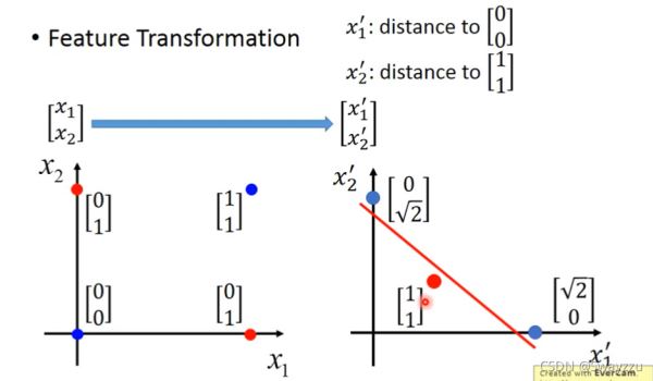 創(chuàng)造一個新的特征x1:到(0,0)的距離,另一個x2:到(1,1)的距離。這樣可以計算出四個點(diǎn)所對應(yīng)的新特征,畫到坐標(biāo)系上如以下右圖所示。這樣轉(zhuǎn)換之后,就可以將轉(zhuǎn)換后的數(shù)據(jù),輸入給一個邏輯回歸,將其完全分開。