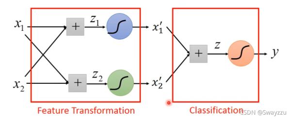雖然我們不容易直接找到這樣的一個轉(zhuǎn)換標(biāo)準(zhǔn),但我們可以通過邏輯回歸去尋找標(biāo)準(zhǔn),使用第一個邏輯回歸,尋找第一個轉(zhuǎn)換后的參數(shù)x1, 再使用第二個邏輯回歸,尋找第二個轉(zhuǎn)換后的參數(shù)x2,將這兩個作為新的輸入,給到第三個邏輯回歸,即可完成分類。