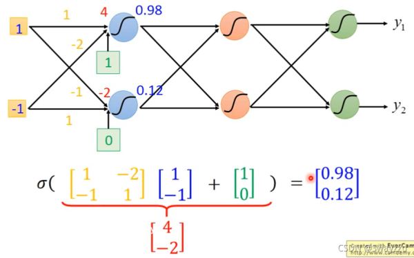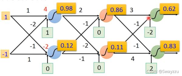 假設(shè)初始輸入數(shù)據(jù)是1和-1,并且所有的權(quán)重我們都知道,比如兩個數(shù)據(jù)到第一層兩個神經(jīng)元的權(quán)重分別是1,-1,-2, 1,然后通過sigmoid函數(shù)轉(zhuǎn)換后,那么我們就可以計算出結(jié)果分別是0.98,0.12,同樣的,假如我們知道后面所有的權(quán)重(參數(shù)),我們最終可以得到兩個輸出,0.62,0.83