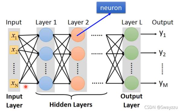 因此,整個網(wǎng)絡(luò)可以看作是一個函數(shù)。更一般地,如下圖所示,每一個圓圈都是一個神經(jīng)元,最前面的輸入叫做輸入層,最后面沒有接任何神經(jīng)元的,叫做輸出層,中間所有的叫做隱藏層。像下圖這樣每一個神經(jīng)元都連接到下一層所有的神經(jīng)元,叫做全連接神經(jīng)網(wǎng)絡(luò)。