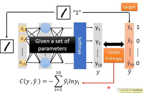 比如輸入的是樣本“1”,有256個像素點(diǎn),也就是256個特征,將其輸入神經(jīng)網(wǎng)絡(luò),最終得到的輸出是一個10維向量,每一個維度,都會有一個概率值,比如是“1”的概率為0.8, “2”的概率為0.1等等,而實際的標(biāo)簽是“1”,也就是只有y1hat是1,其他是0。將這兩個向量求出交叉熵并求和,如上圖的式子,得出的C就是這個樣本的損失。
