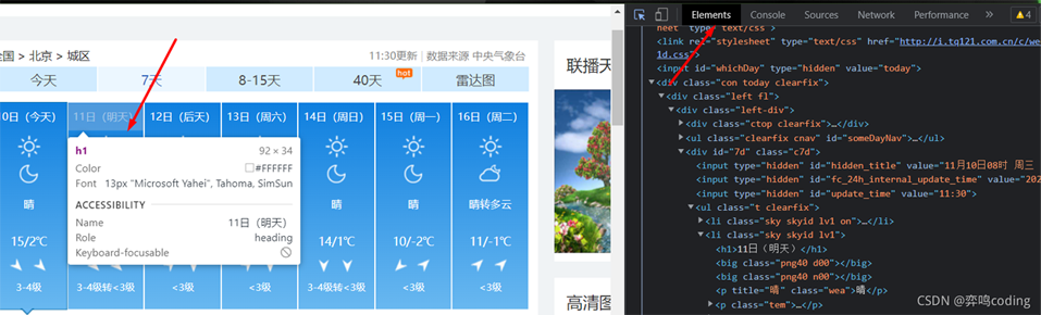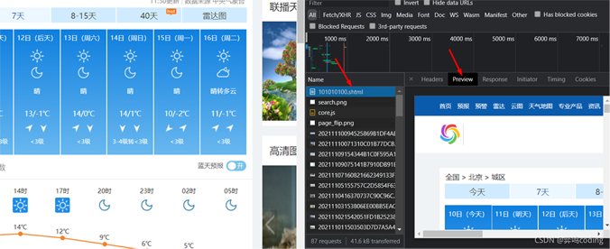 我們可以看到7天的天氣和8-15天的天氣,再往后對我們來說就沒必要了。我們查看七日的天氣預(yù)報(bào),直接爬11日的天氣,鼠標(biāo)右鍵->檢查->Network->刷新網(wǎng)頁->查看列表第一個(gè),再點(diǎn)擊preview