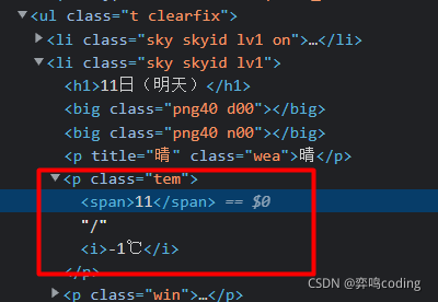 可以發(fā)現(xiàn),溫度數(shù)據(jù)放在<p class="tem">之下?!岸嘣啤彼诘奈恢檬?code><p title="晴" class="wea">晴</p>。