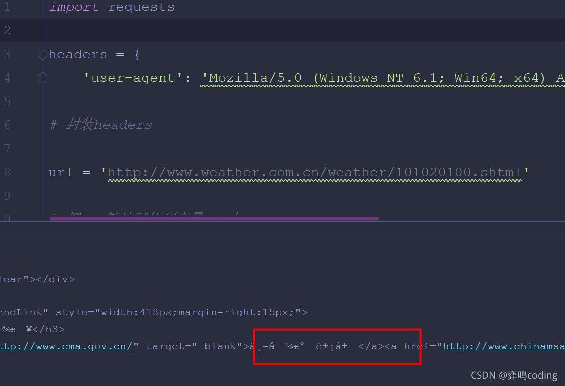 看結(jié)果可以看到是響應(yīng)是正常的,但是出現(xiàn)了亂碼。但是莫慌。加上一句res.encoding='utf-8'就行了。
