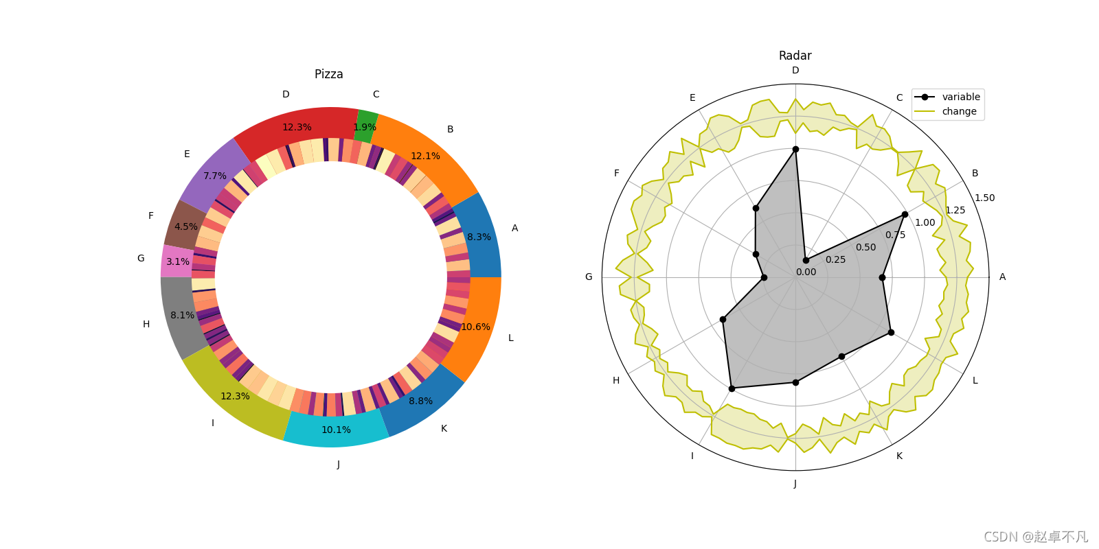 餅圖:左上玫瑰圖顯示兩層信息(外層標(biāo)簽和內(nèi)層比例分布)。