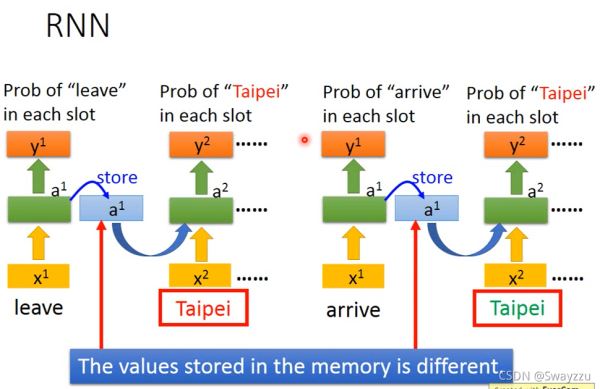如下圖所示,當(dāng)“臺(tái)北”這個(gè)詞被輸入的時(shí)候,前面的詞有可能是“離開“,有可能是”到達(dá)“,如果把上一次輸入的”離開“,所得的隱藏層內(nèi)容,輸入給下一層,這樣就有可能區(qū)分開是”離開臺(tái)北“,還是”到達(dá)臺(tái)北“。