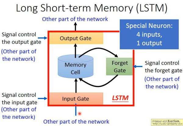Long Short-term Memory,其實(shí)當(dāng)人們說到使用RNN的時(shí)候,通常都是使用的LSTM。對(duì)于LSTM的每一個(gè)單元,除了輸入的數(shù)據(jù)之外,還有另外三個(gè)“門”來控制輸入,輸出,存儲(chǔ)。如下圖所示,如此一來,每一個(gè)LSTM單元共有4個(gè)輸入,以及1個(gè)輸出。