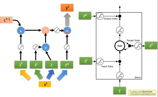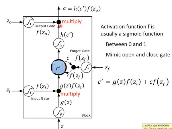 最終得到的輸出是h(c),但如果輸出門輸入z0后計(jì)算的結(jié)果是0,則該輸出就無法輸出,是1的時(shí)候才可以輸出。