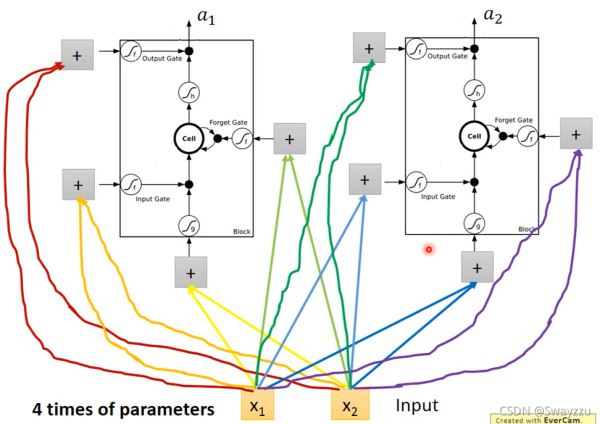 LSTM和DNN的區(qū)別,就是把神經(jīng)元換成了LSTM單元,輸入的數(shù)據(jù)乘上權(quán)重之后,來控制各個(gè)門。因此參數(shù)變成平常DNN參數(shù)的4倍。