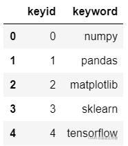 {'numpy': 0, 'pandas': 1, 'matplotlib': 2, 'sklearn': 3, 'tensorflow': 4}