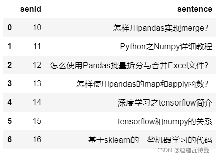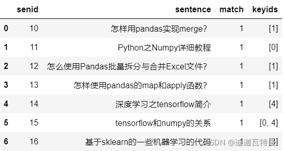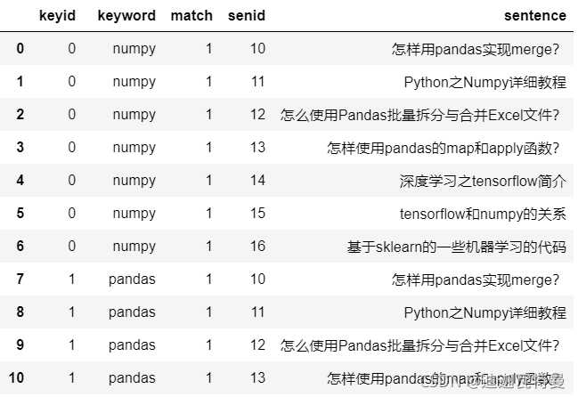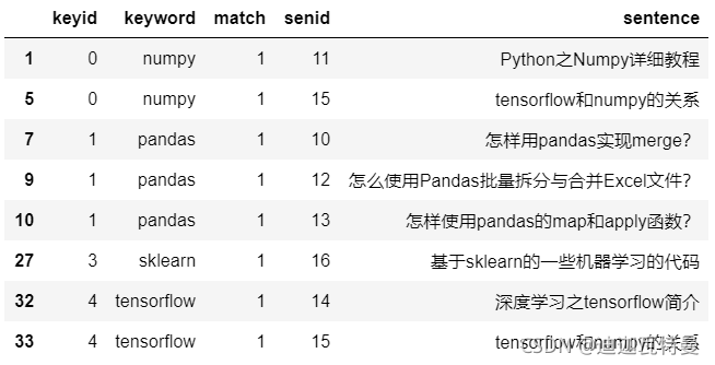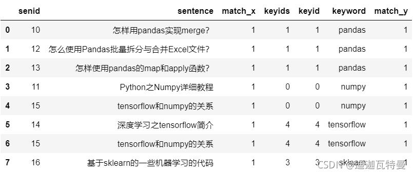 def merge_func(row): #新增一列,表示可以匹配的keyid row["keyids"] = [ keyid for key_word, keyid in key_word_dict.items() if re.search(key_word, row["sentence"], re.IGNORECASE) ] return row df_merge = df_sentence.apply(merge_func, axis = 1)