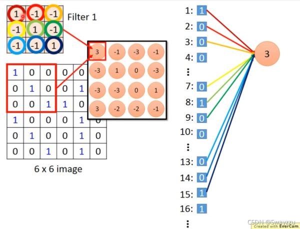 卷積層相當(dāng)于降采樣的神經(jīng)網(wǎng)絡(luò),如下圖,本來應(yīng)該連接36個神經(jīng)元,但實際連接了9個。